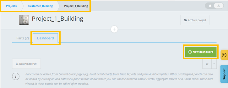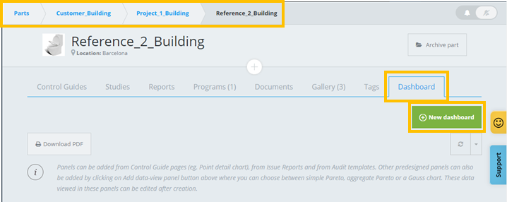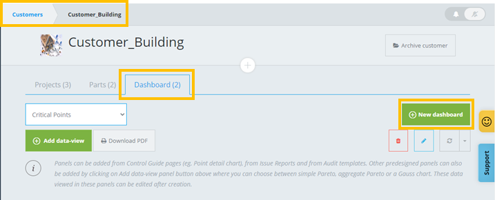 A part dashboard is obviously more specific than the other dashboards. For example you can have a dashboard for critical points, measurement activity and last months data filtered. The data is only available for those users who are admins or managers in its location.