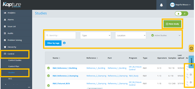 All Studies (both Repeatibility and R&R studies) created on KaptureIO are available for manager and administrator users (to learn more about Users, click here) on Control>Studies, showing its most important information and related actions.
